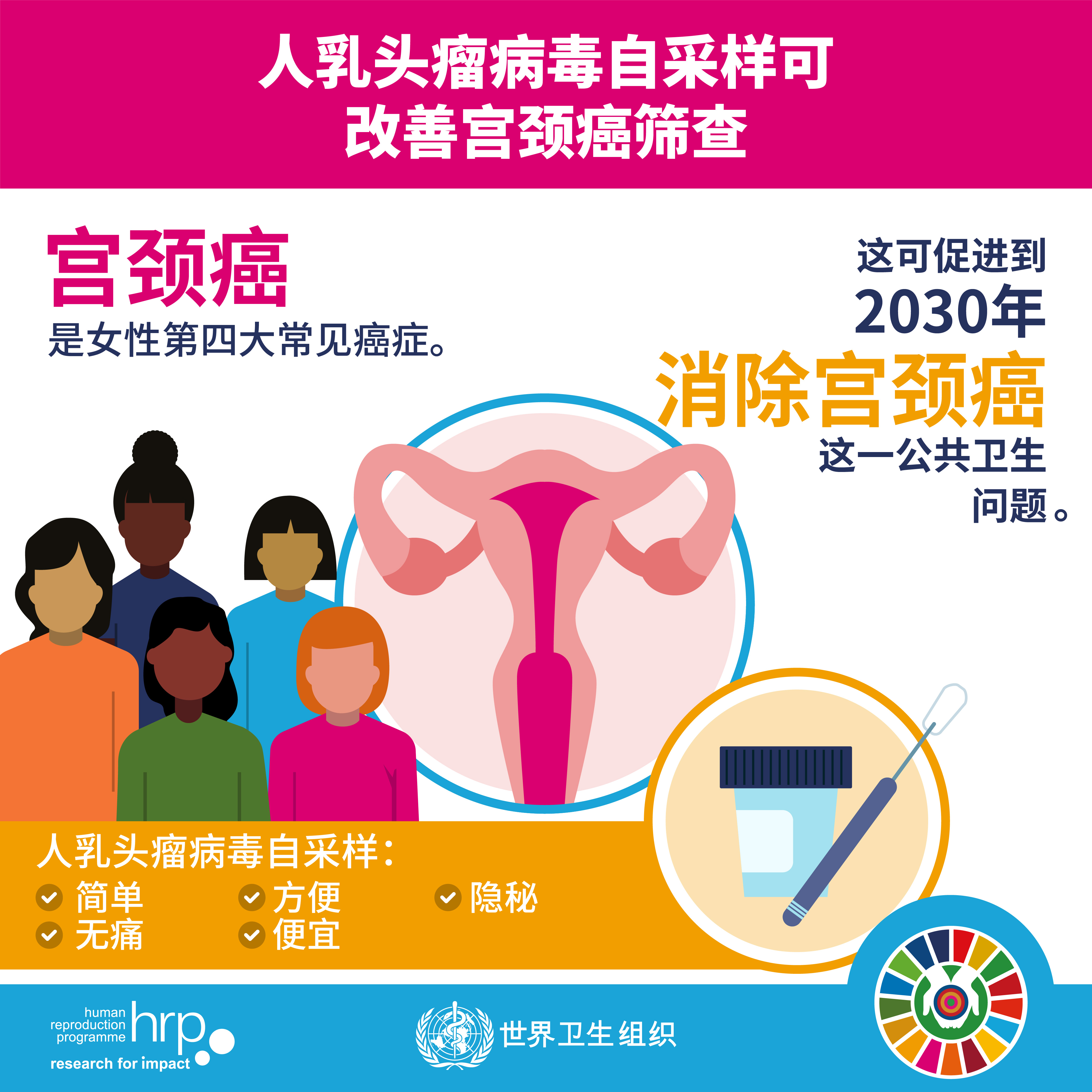 世界卫生组织关于消除宫颈癌的全球行动号召,明确HPV自采样可改善宫颈癌筛查,具有简单、方便、隐私、无痛及经济等优点。